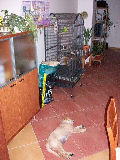 Všichni taky říkají, že rostu jak z vody (a přitom rostu z granulí Purina ProPlan), už vidím na Igora z větší blízkosti. Občas, když mám radost, tak stojím u klece a štěkáním ho vyzývám ke hře. On si lozí po kleci a ignoruje mě :(